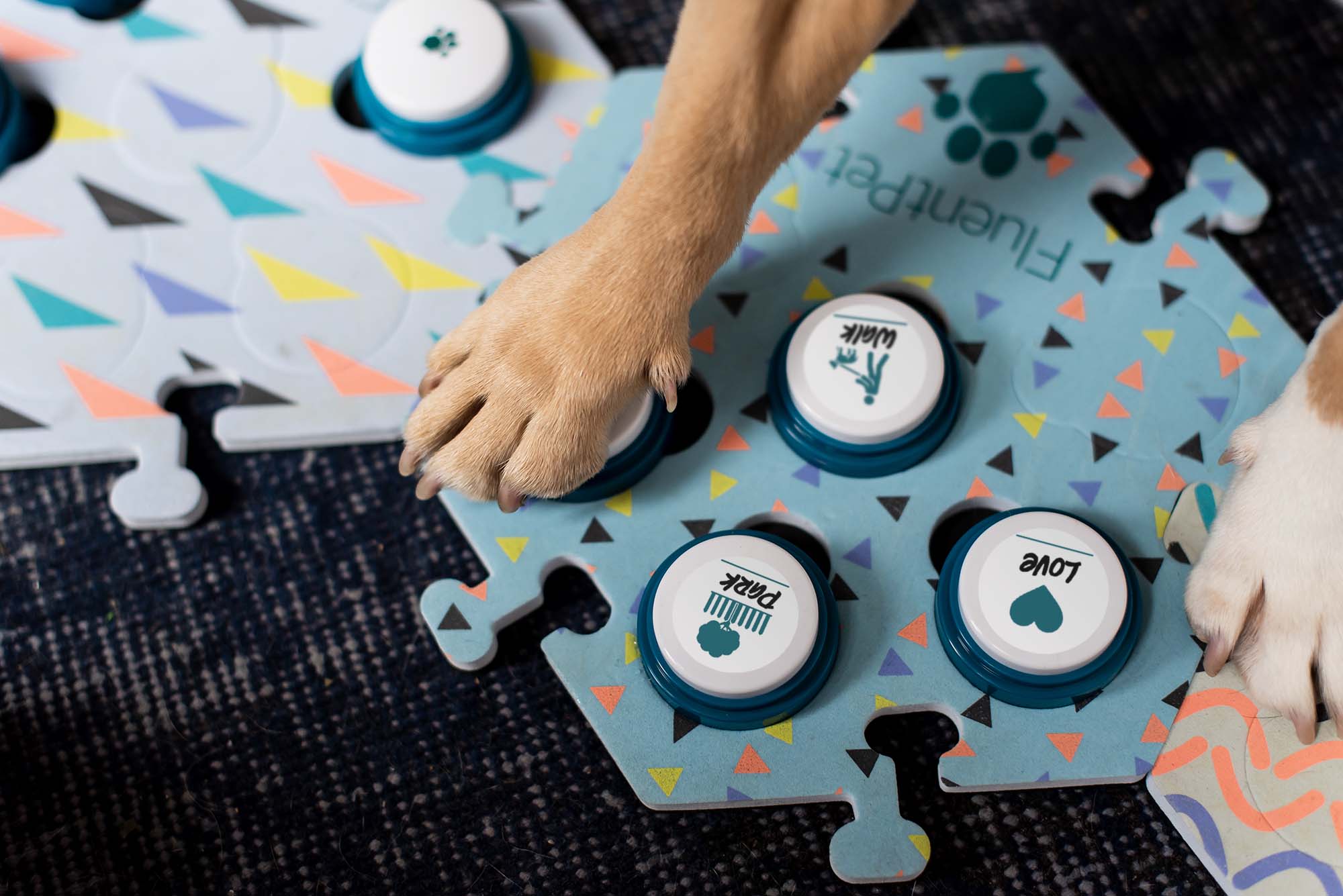 For example, if they accidentally walk onto the PLAY button, you can grab a nearby toy and ask, “Did you want to PLAY? Want to PLAY?” Then, press PLAY again and play with them.